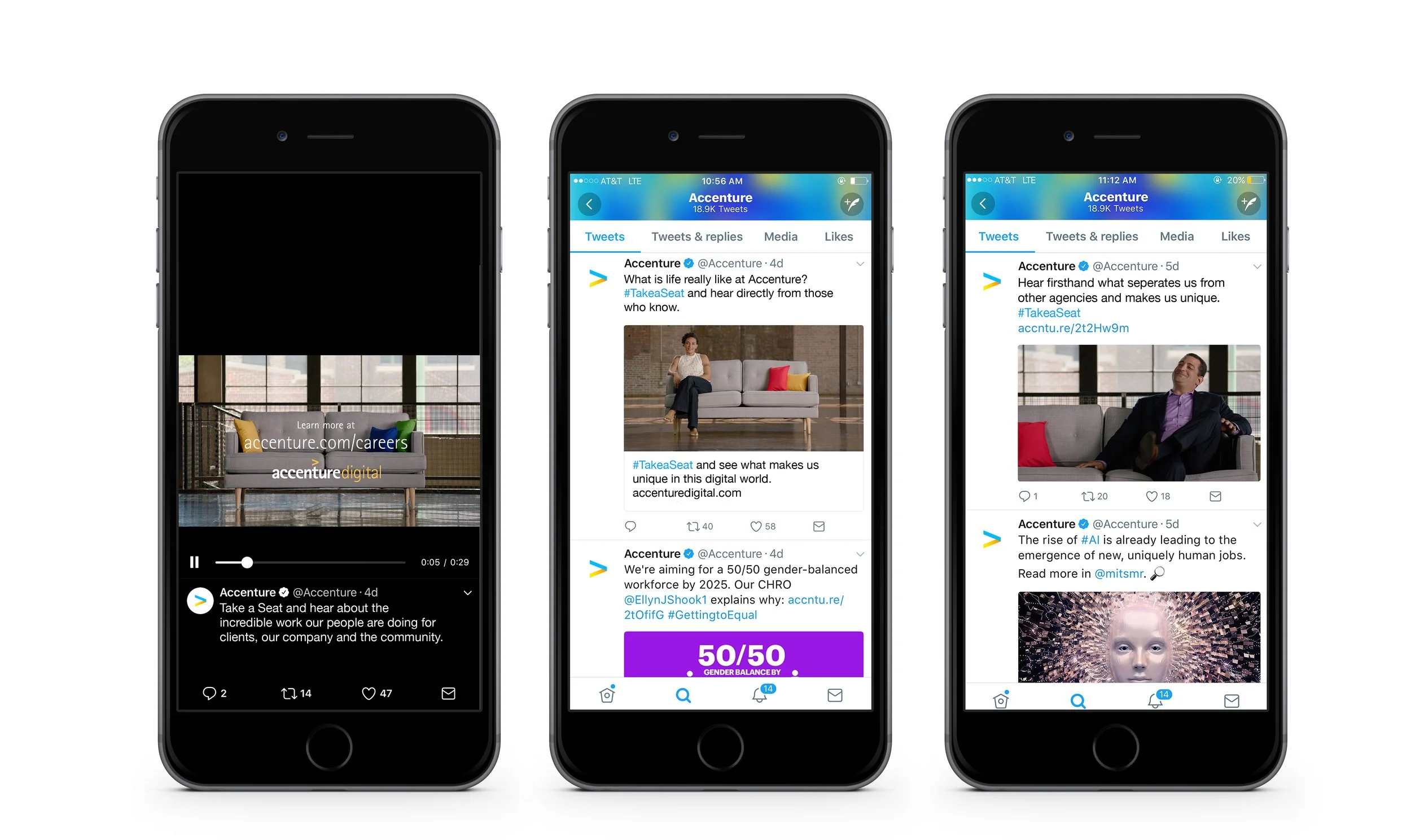 We created a series of employee vignettes and kicked off the campaign with a montage of real employees sharing their personal views of the Accenture culture. Using social, we showcased different employees and invited others to share their stories by joining in with #TakeASeat.